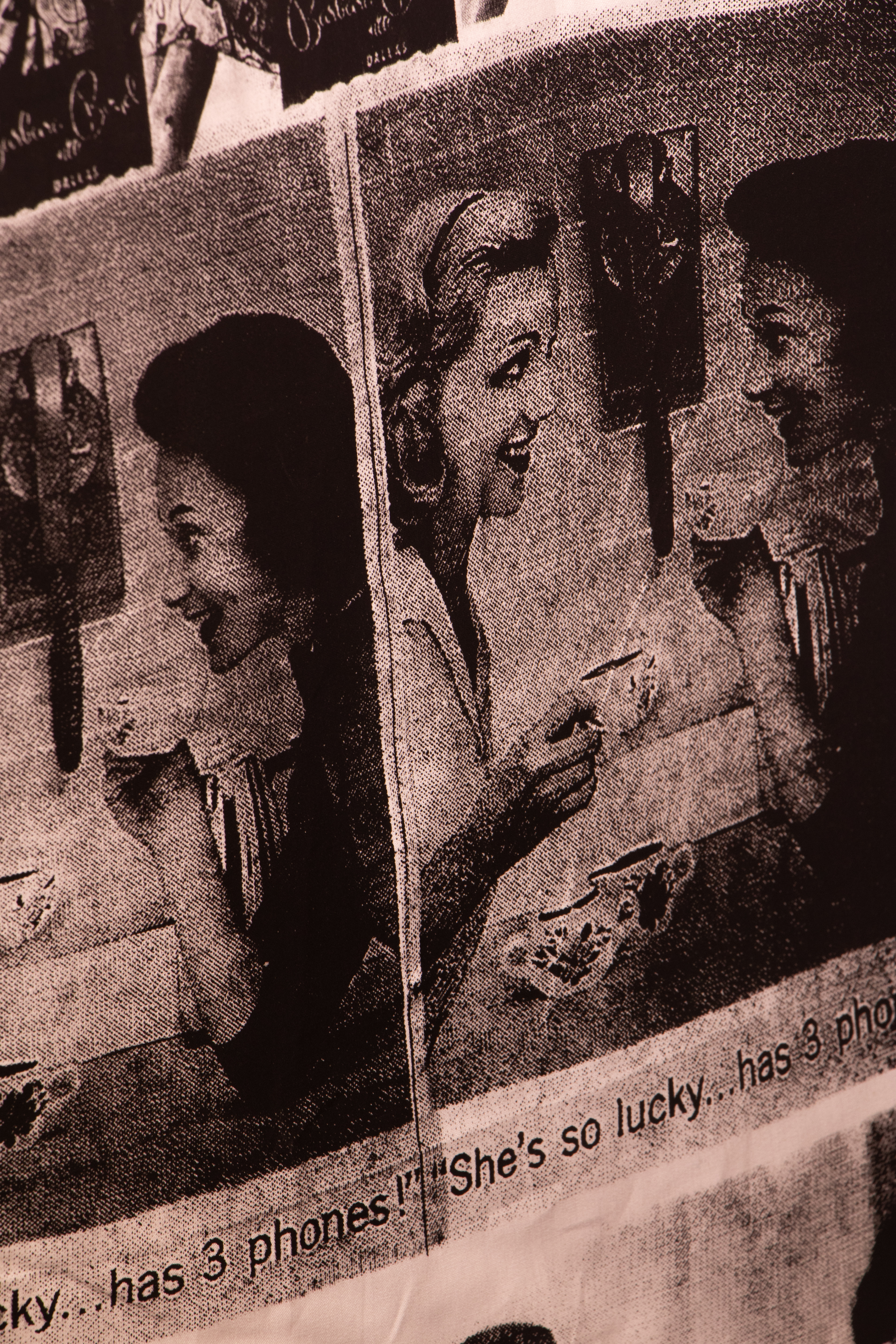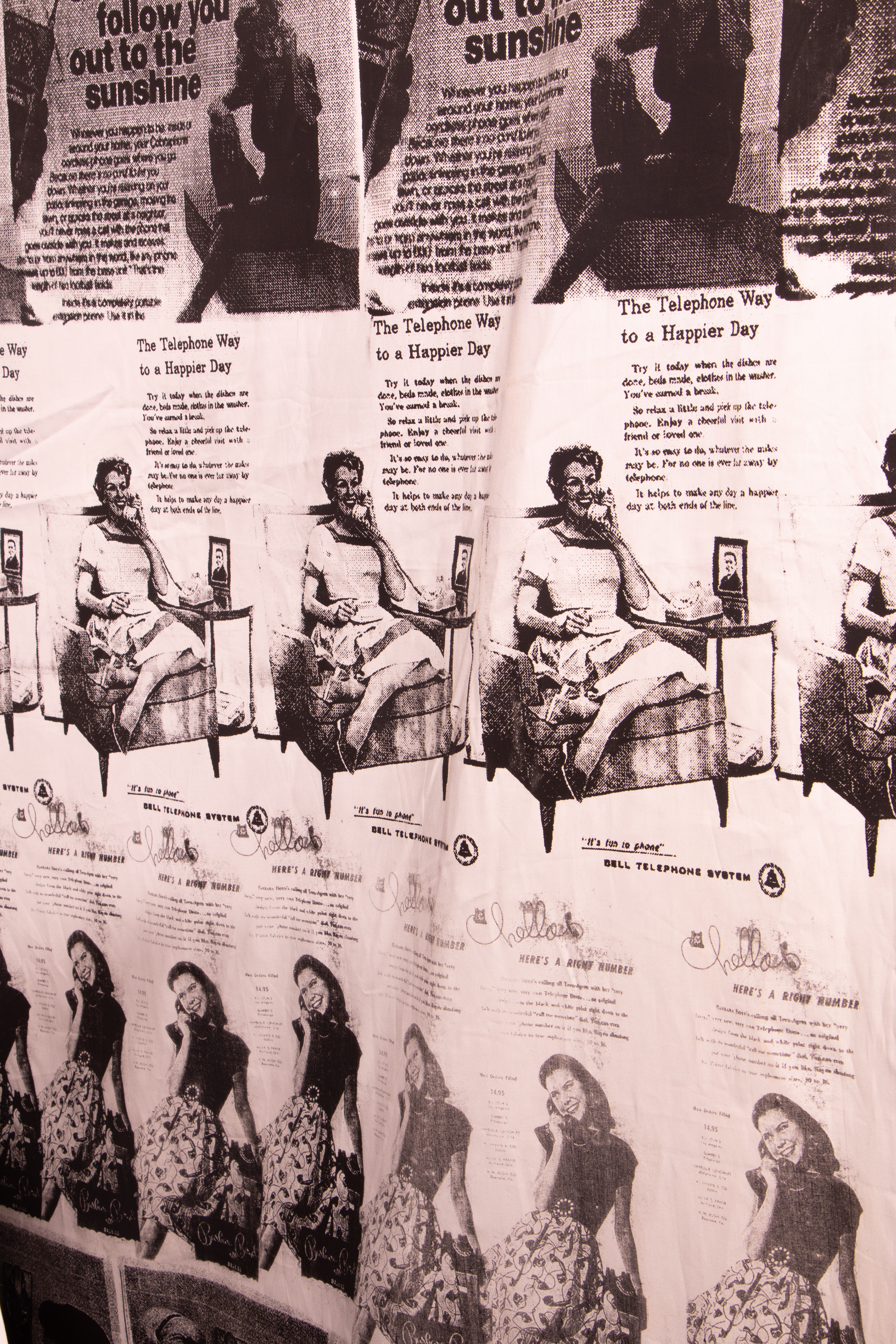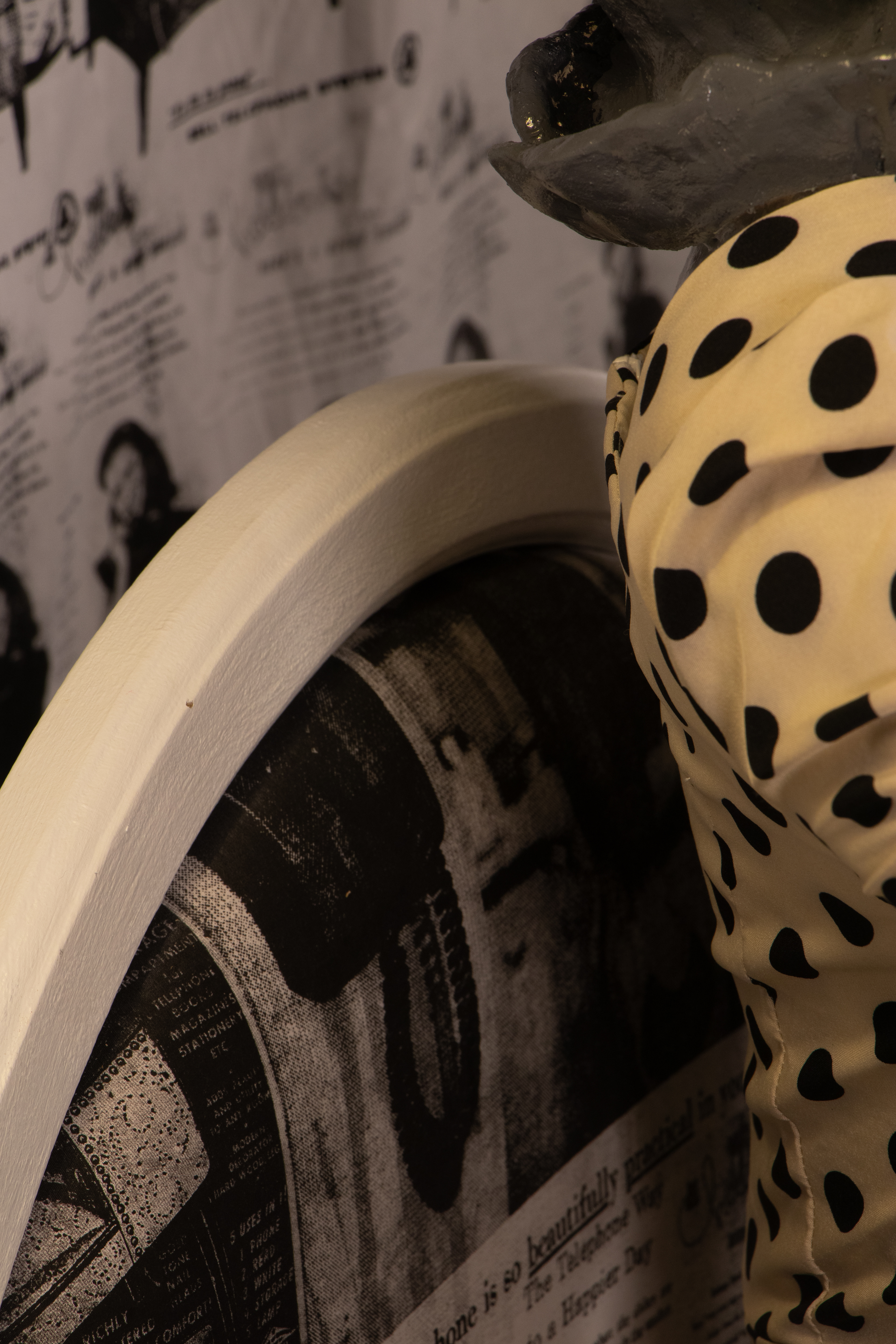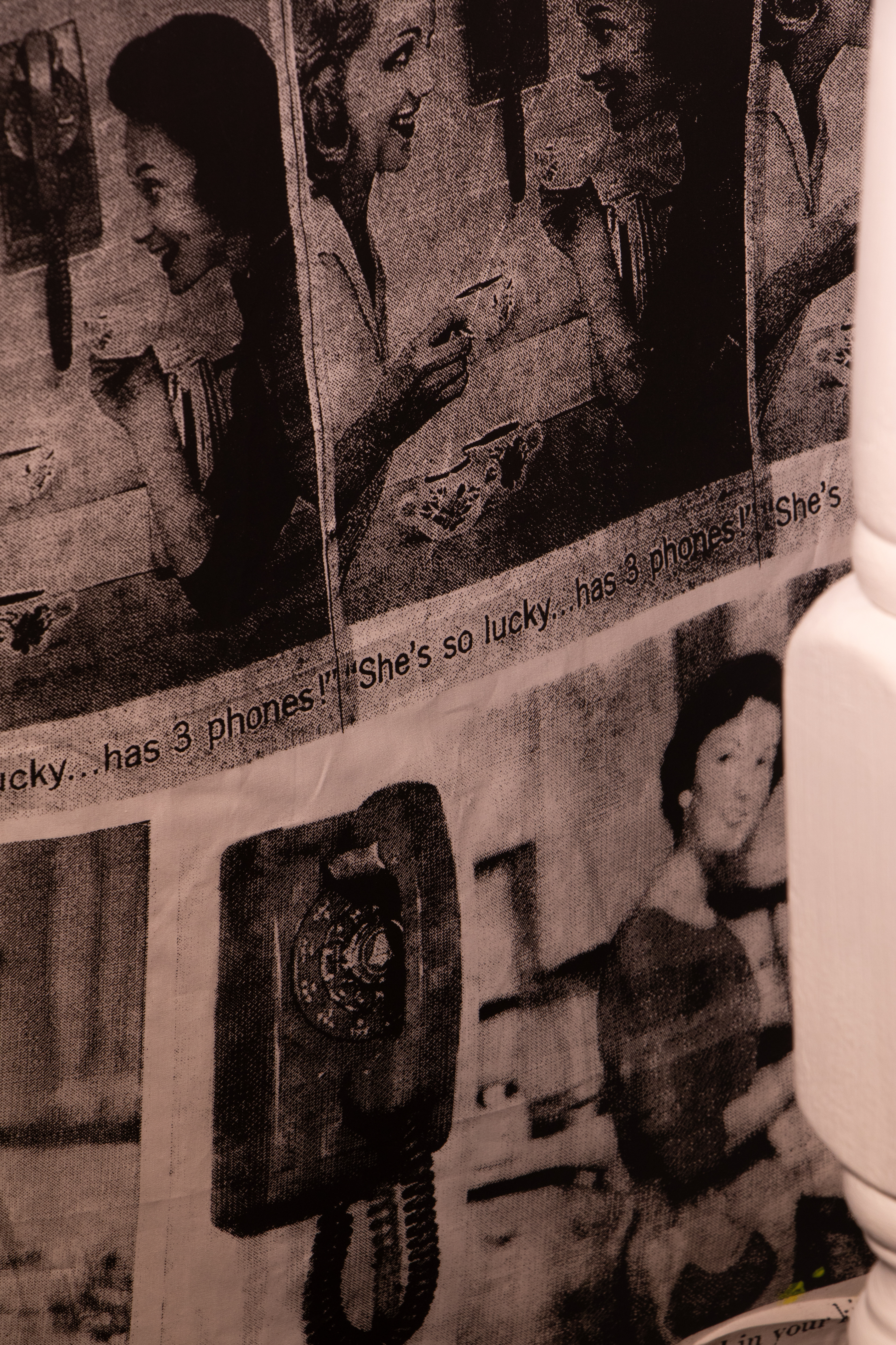 Stoneware, wood, cotton fabric, acrylic ink, and interior paint.